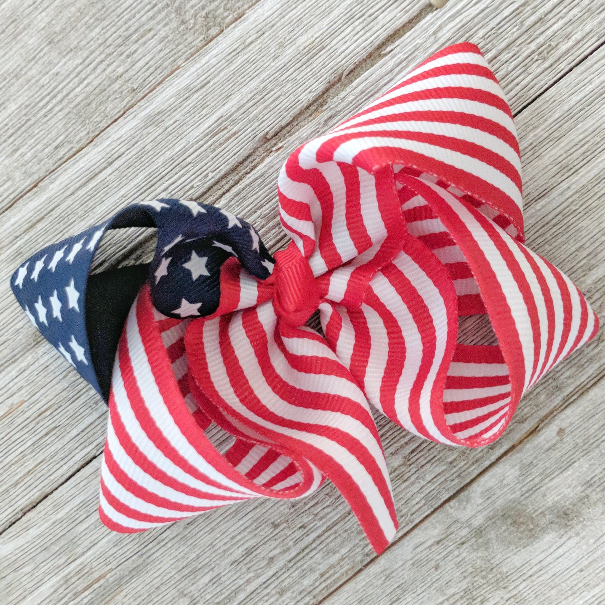 This 4" wide American Flag Ribbon Hair Bow is perfect for showing your patriotism this 4th of July. This accessory is sure to add a festive touch to your holiday. The perfect size for all ages.