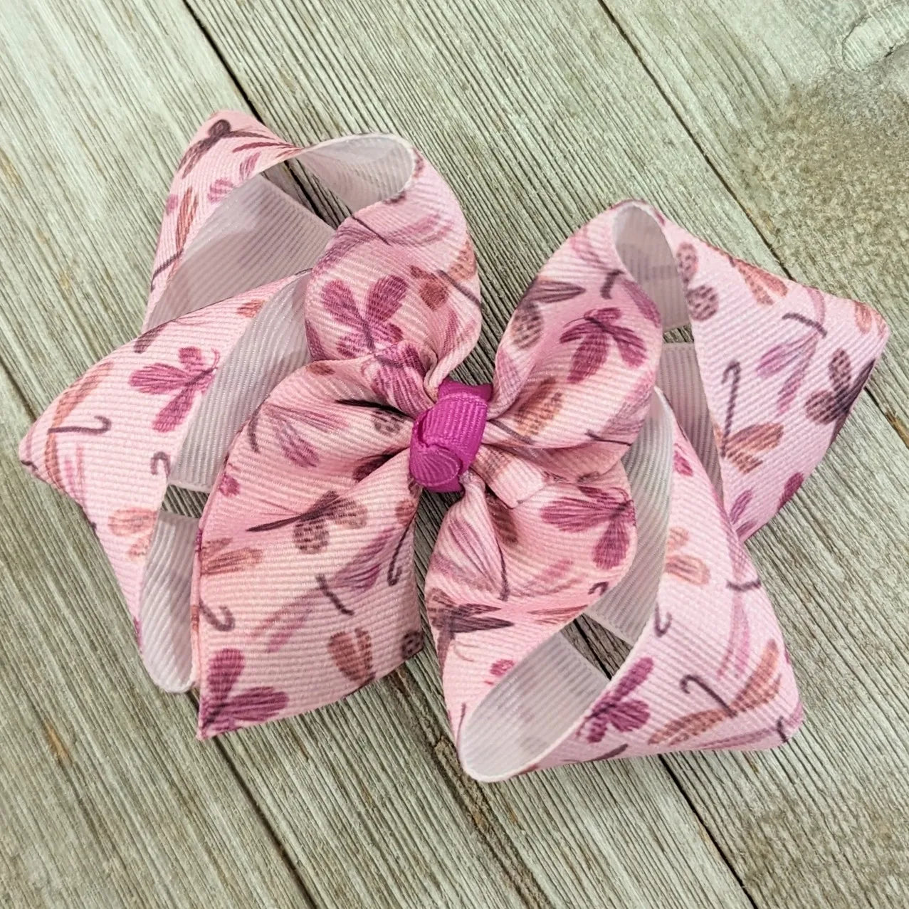 This 4" boutique bow is made with 1.5" ribbon with a dragonfly and butterfly print.