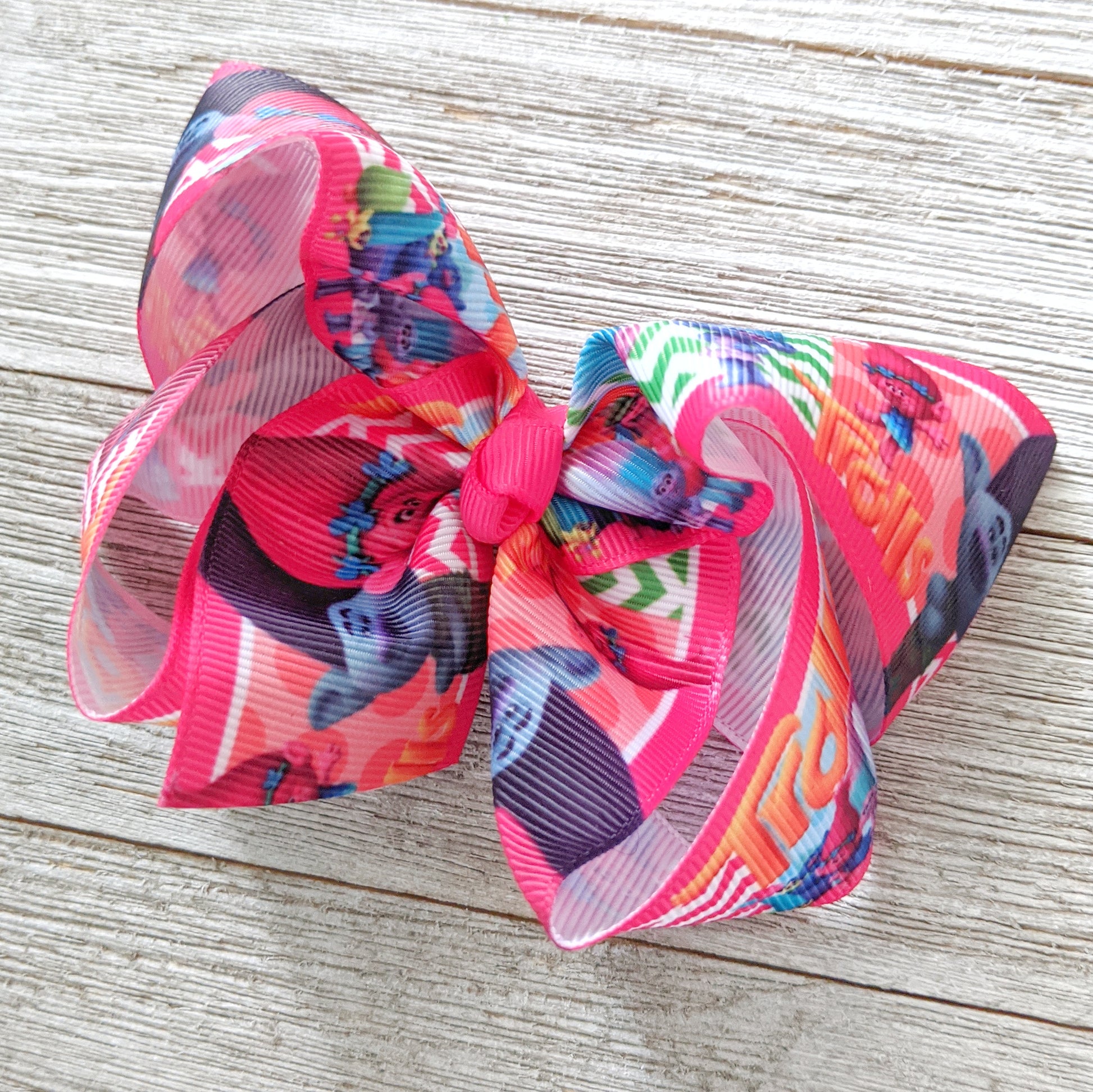 This 4" boutique bow is made with a Trolls print ribbon. The ribbon is high quality, 1.5" grosgrain ribbon. The center has been stitched to ensure it doesn't come apart.