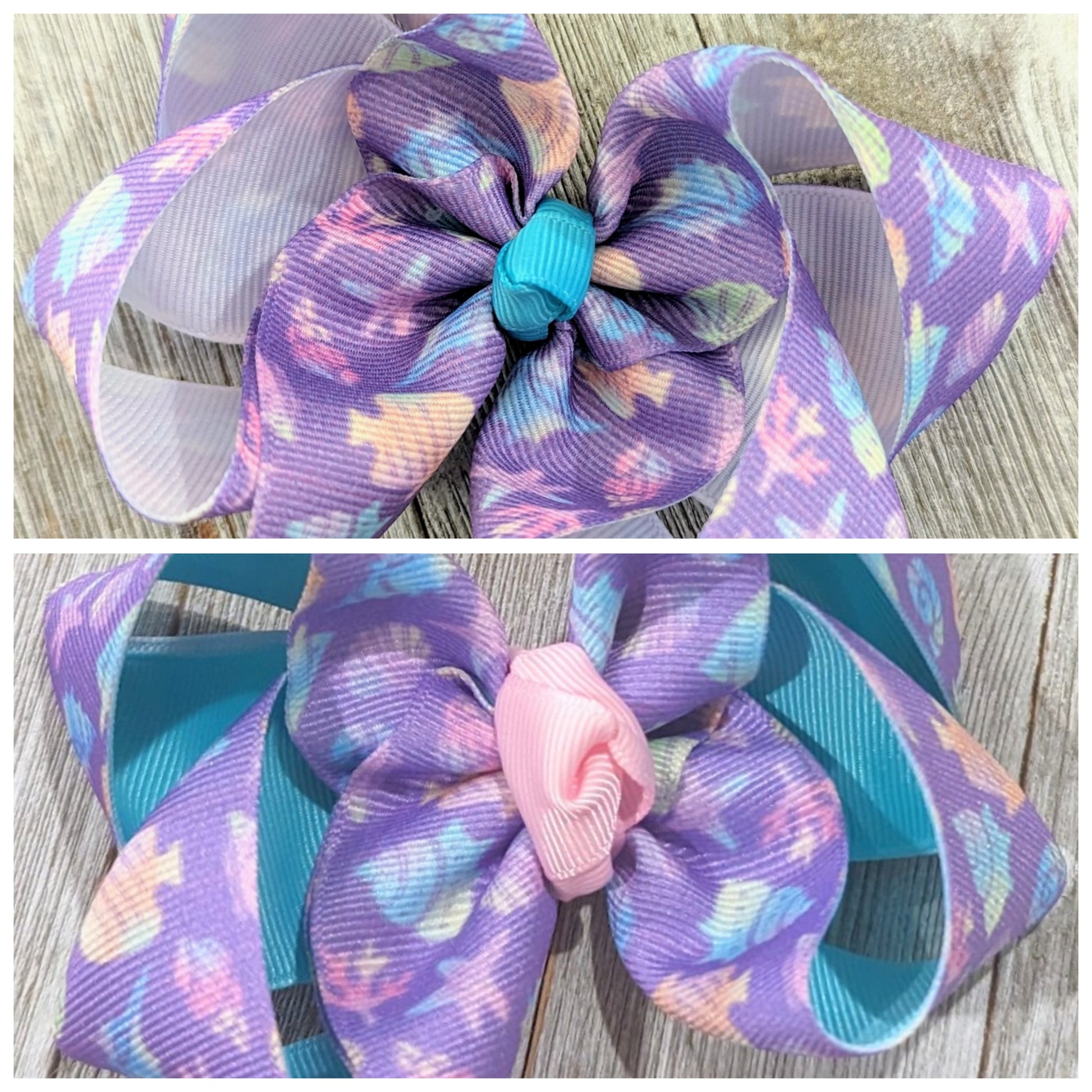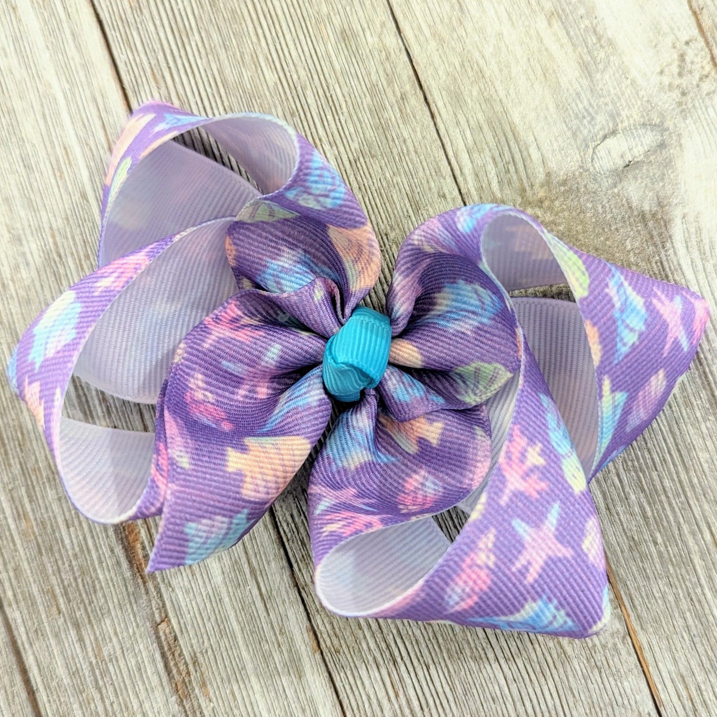 This 4" boutique bow is made with 1.5" ribbon with a fish, starfish, seashell print.