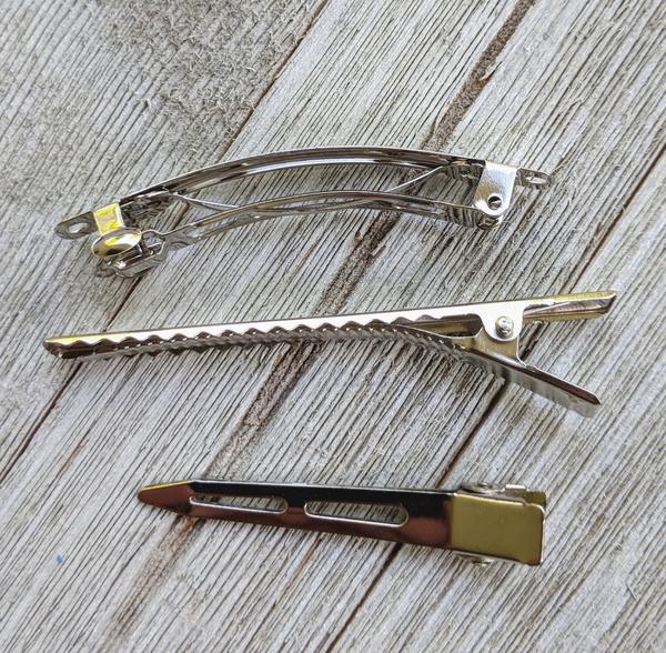 It can be attached to a large partially lined single prong alligator clip (no teeth), a 3" alligator clip with teeth, a french barrette, or a nylon headband