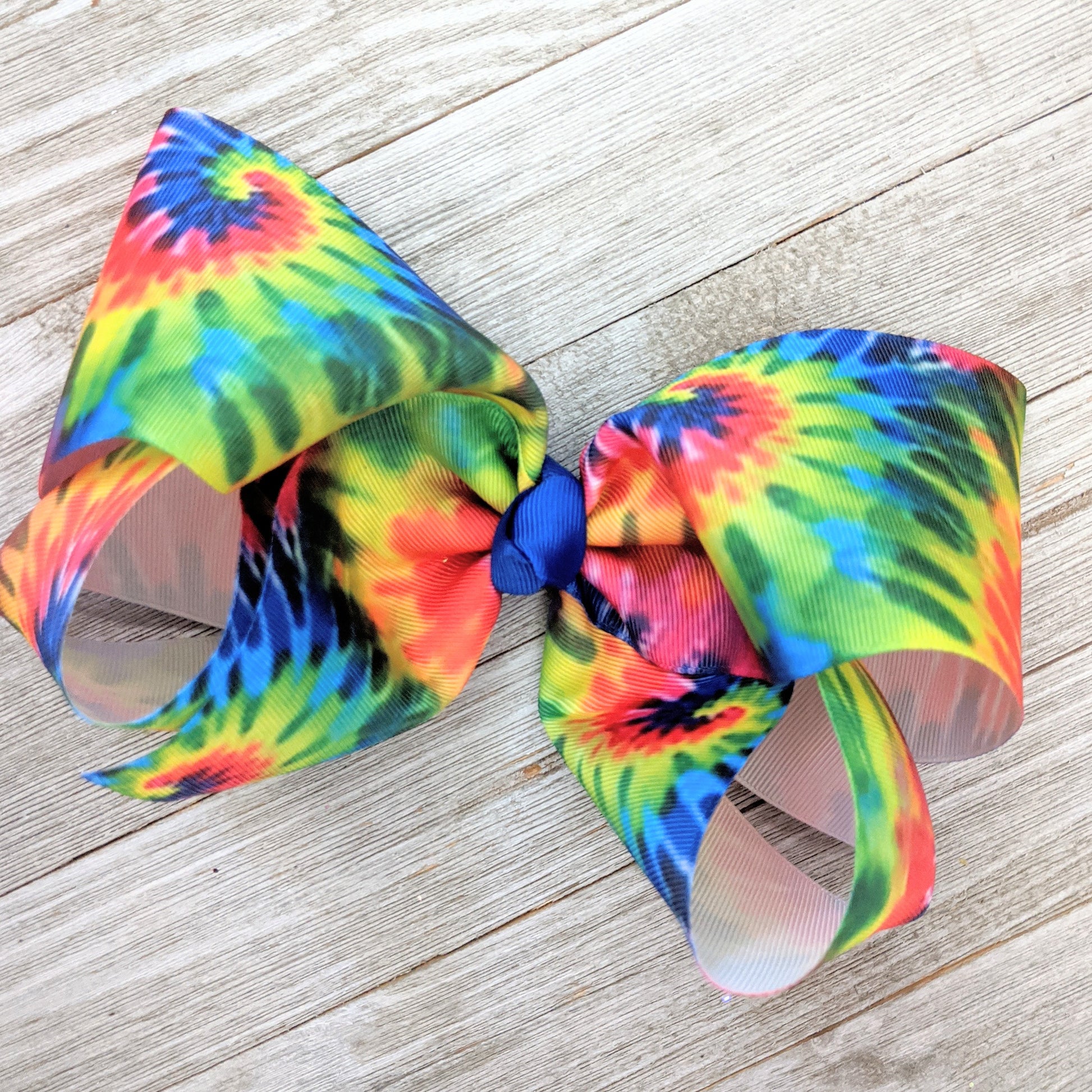 7-8" across and made of 3" ribbon with a rainbow tie-dye ribbon.