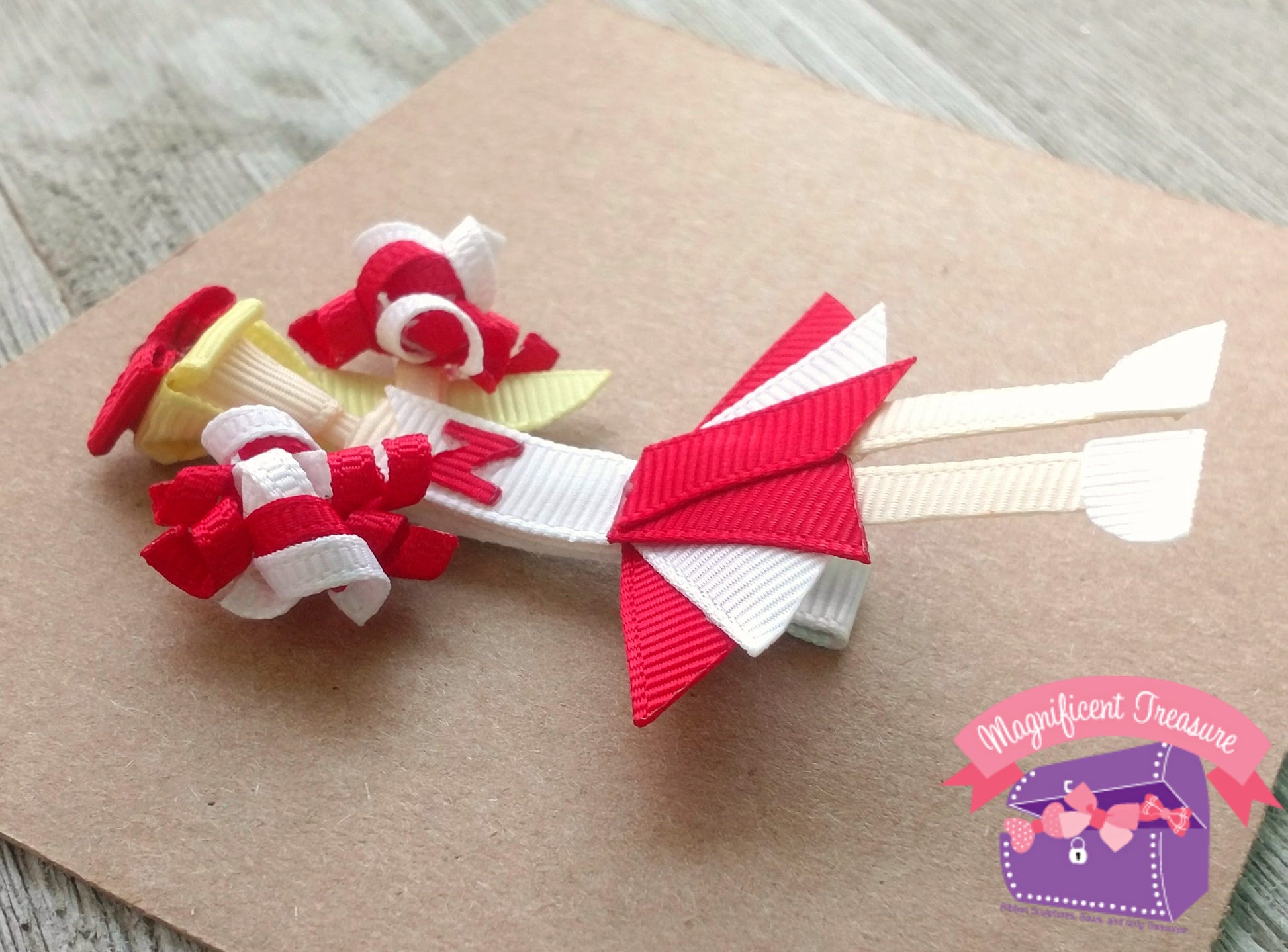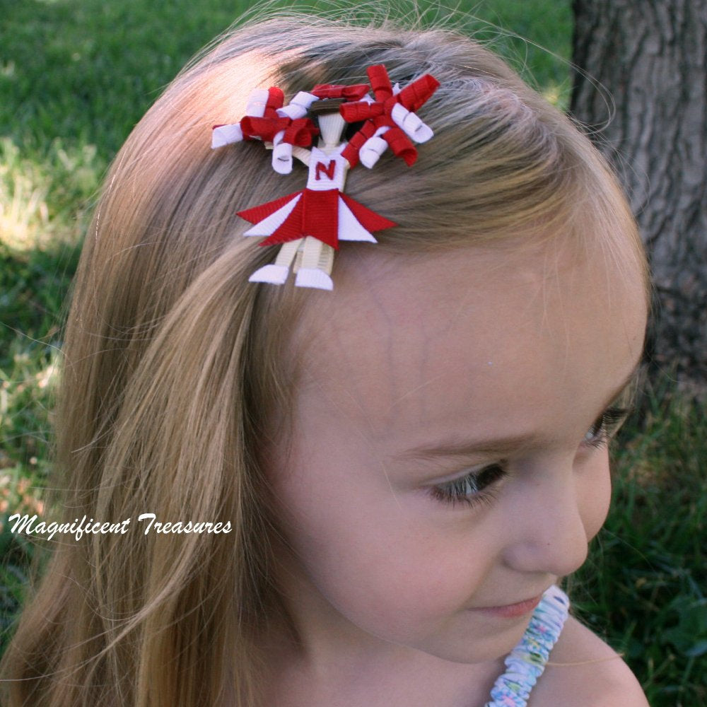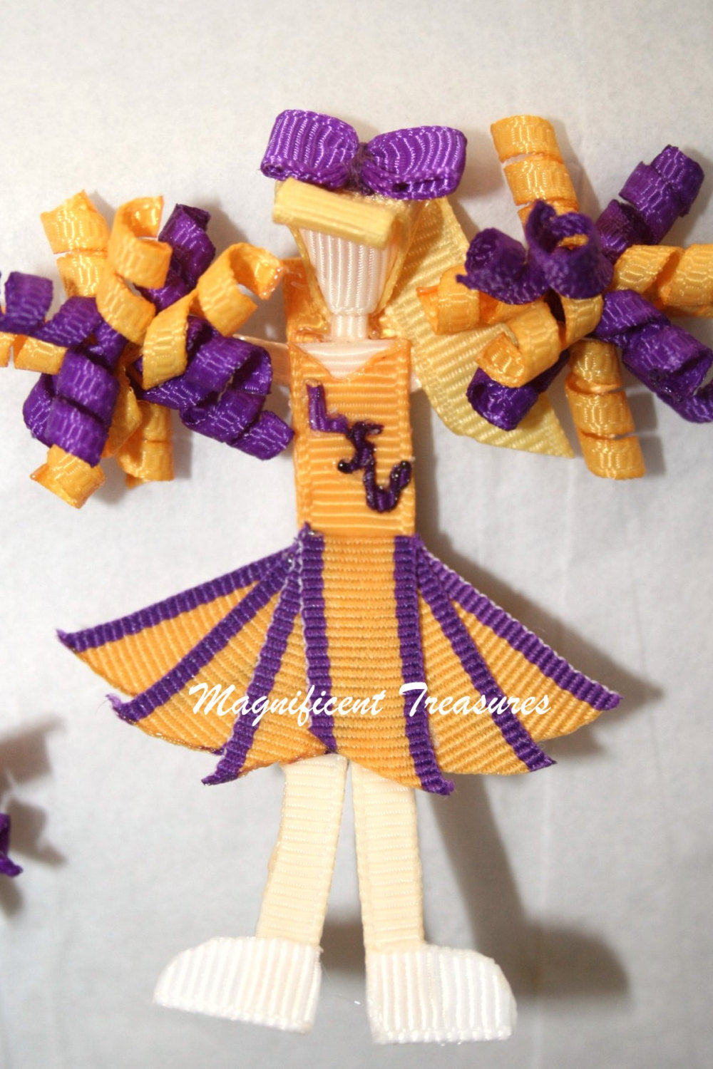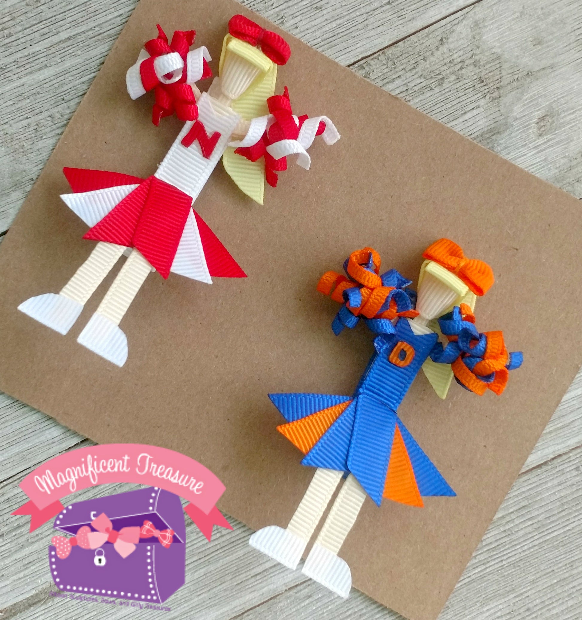 This cute little cheerleader is perfect to help cheer on your favorite team. She is made with grosgrain ribbon that has been treated to prevent fraying. The clip/pin measures about 3 inches tall.
