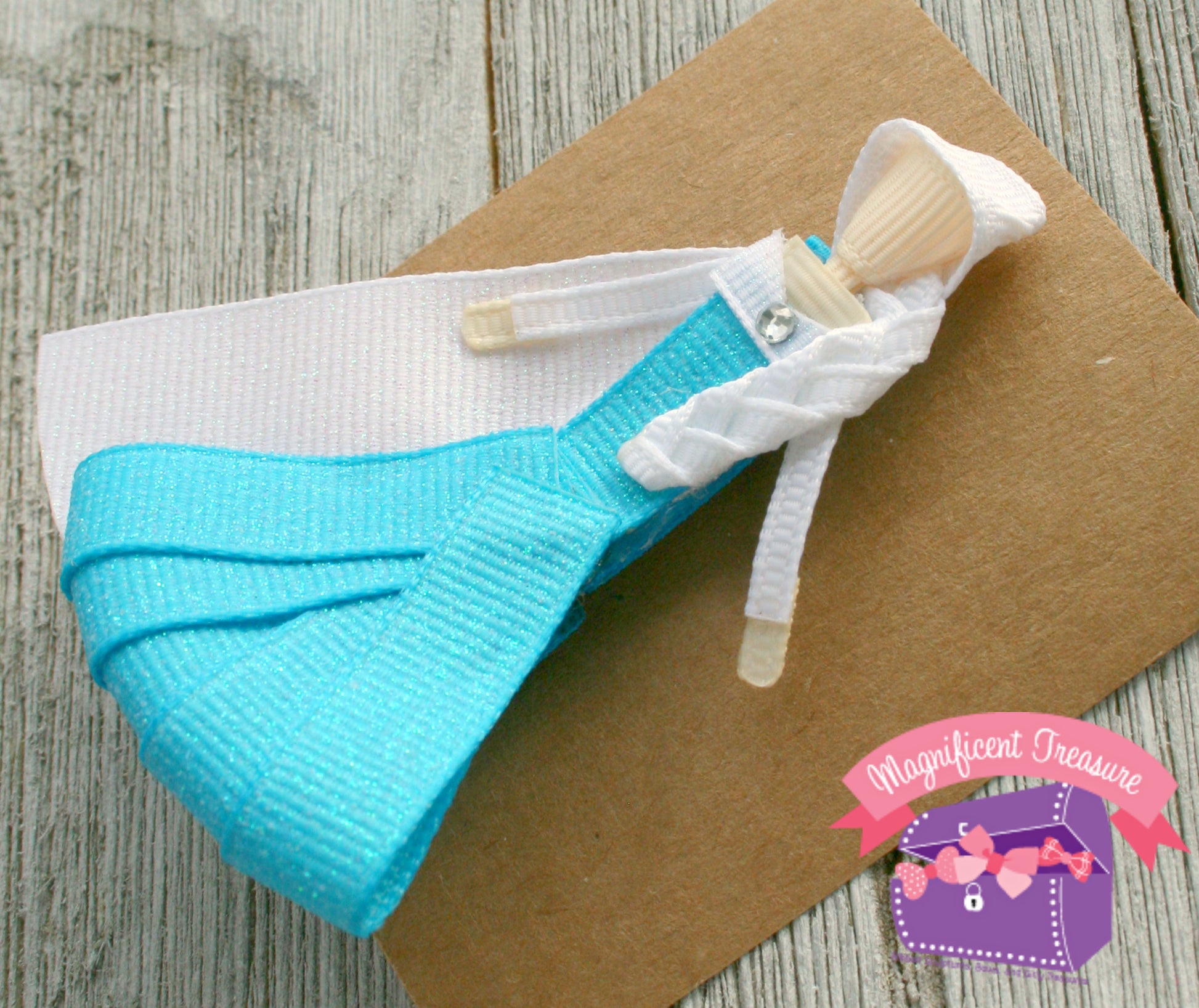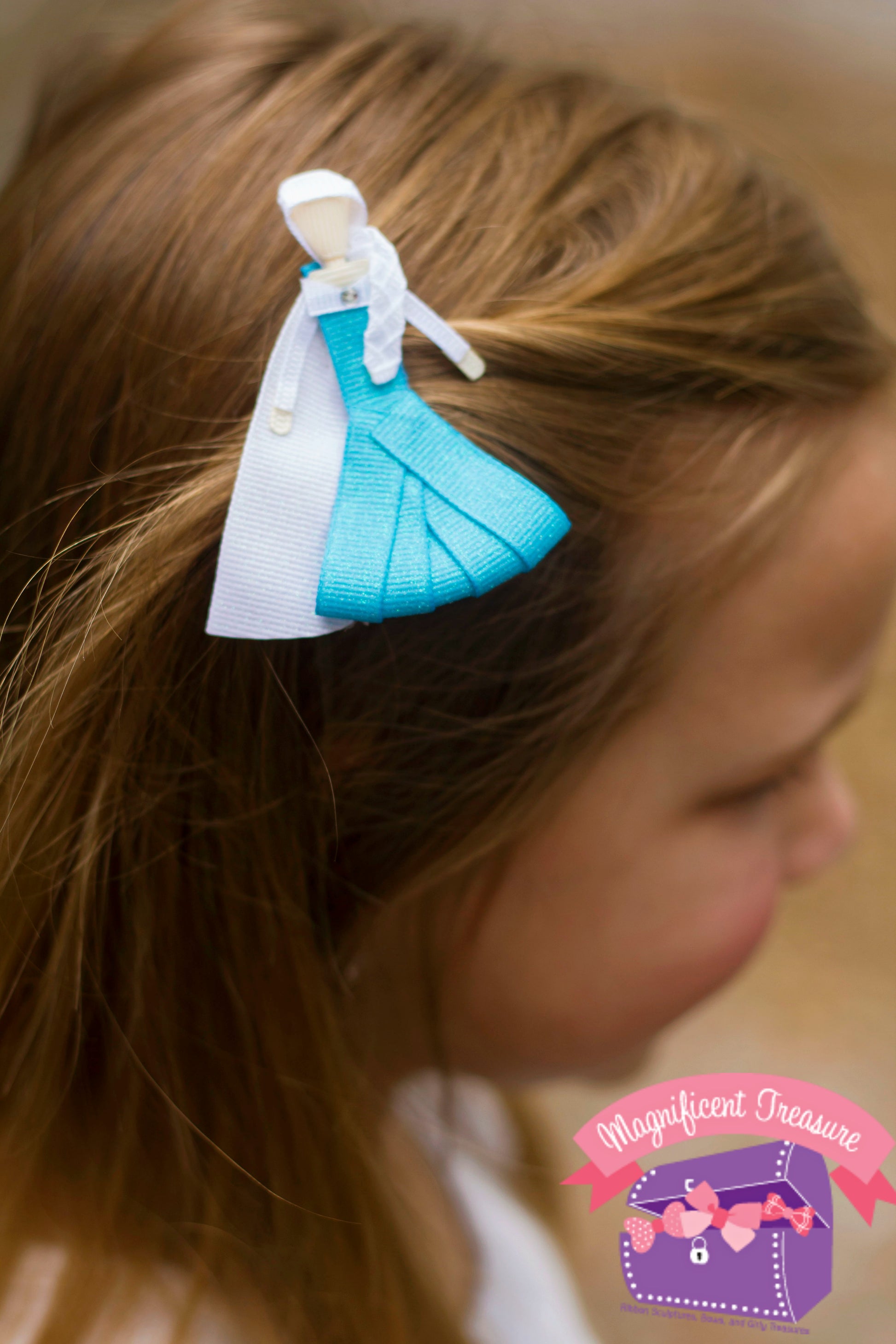She measures about 3 inches tall. She can come attached to a partially lined single prong alligator clip, a double prong alligator clip, or a pin. A no slip grip can be added to the alligator clips. The clip runs up her back to provide stability and so she can be worn on either side of the head.