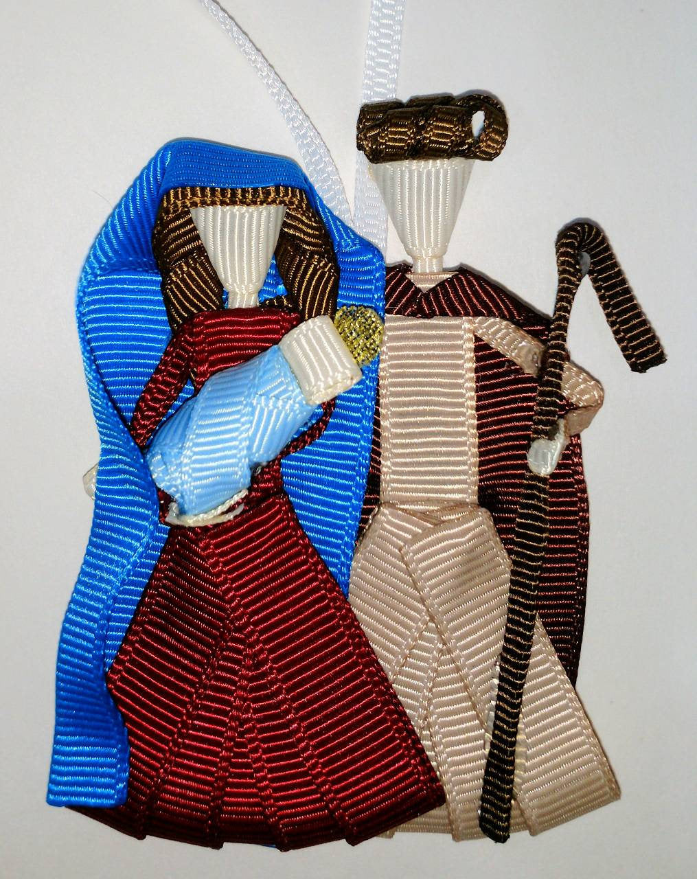 This ribbon sculpture is of the Holy Mother holding a baby Jesus with Joseph. It is perfect to celebrate the real reason for the season. The sculpture is about 3" tall and has a ribbon loop to make it a Christmas tree ornament. This is highly detailed and made of grosgrain ribbon that has been heat sealed to prevent fraying.