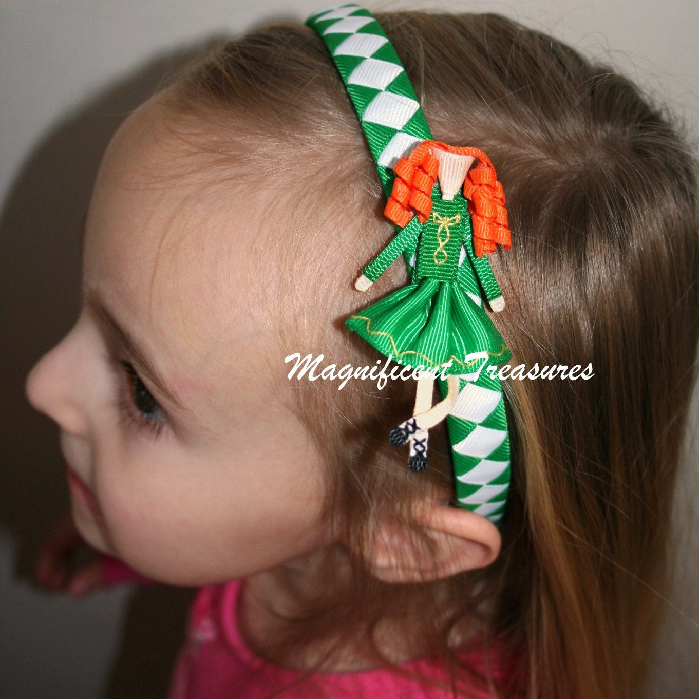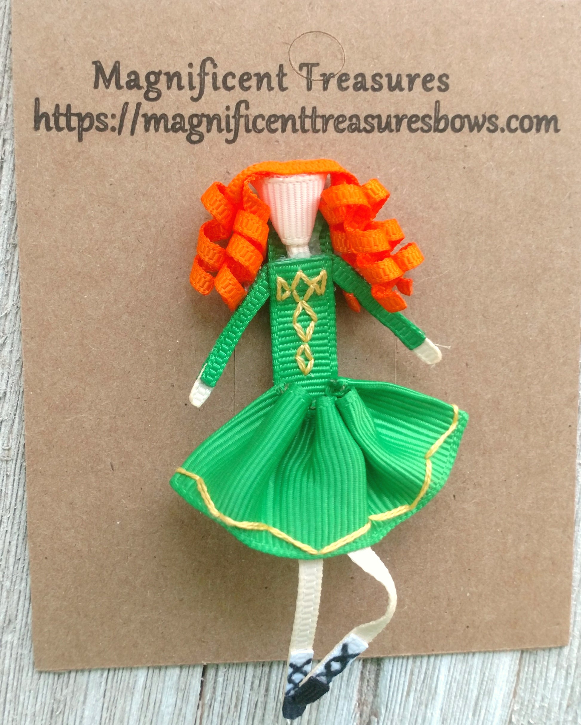 An Irish dancer hair clip or pin for St. Patrick's Day or any day! This dancer girl is made of ribbon with handstitched details.