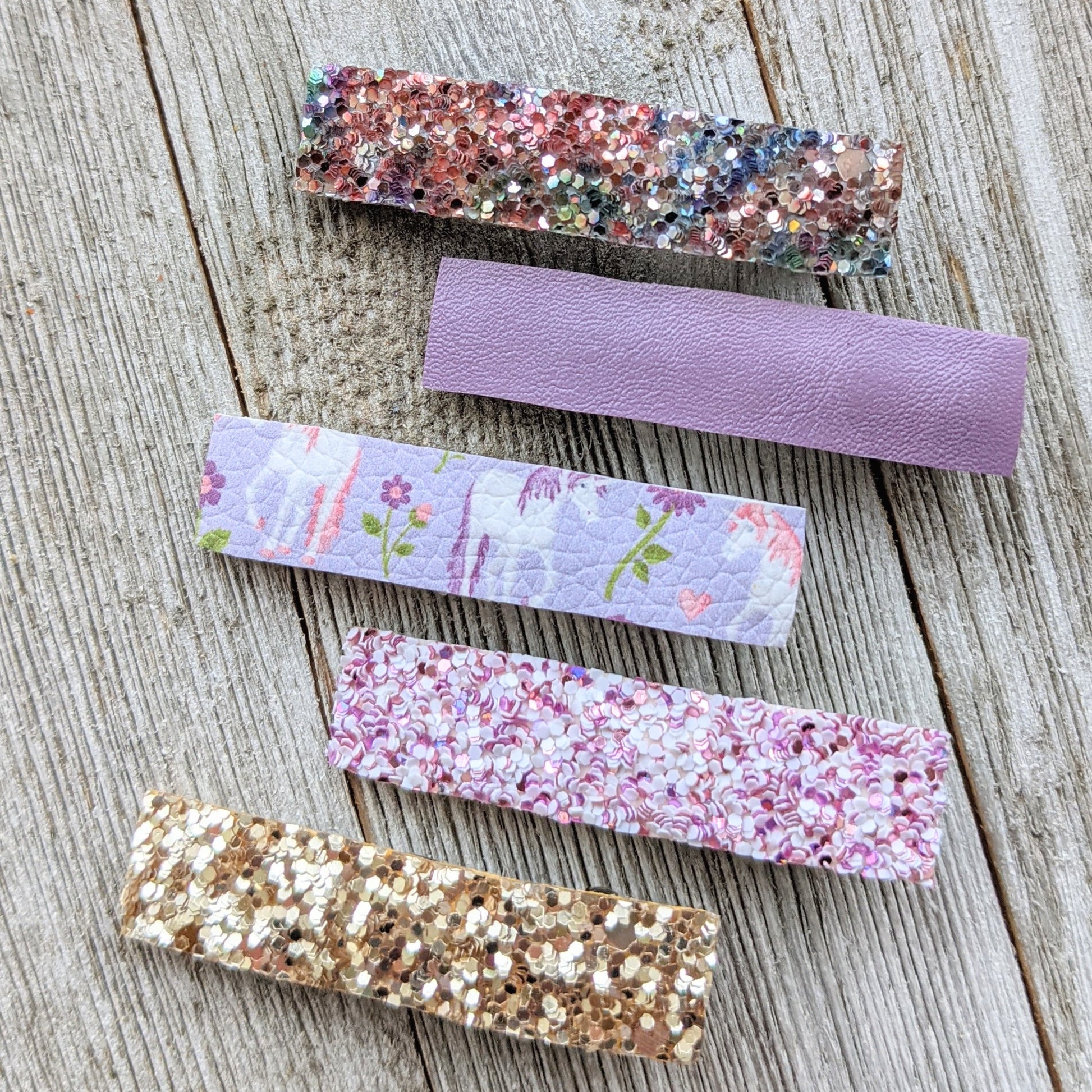Set of 5 alligator clips with teeth with faux leather or glitter.