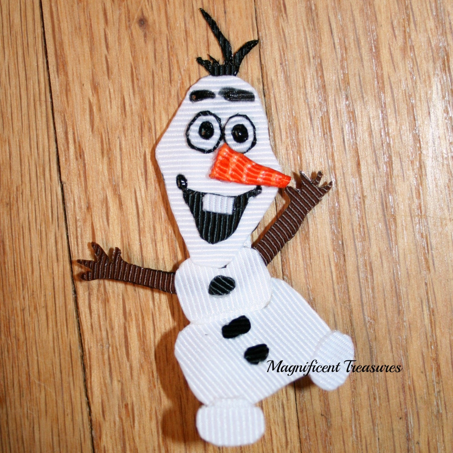Olaf is about 3 inches tall. He can be attached to a partially lined single prong alligator clip, a double prong alligator clip, or a pin. A no slip grip can be added to the alligator clips. The clip/pin runs up the back of Olaf to provide stability and so he can be work on either side of the head.