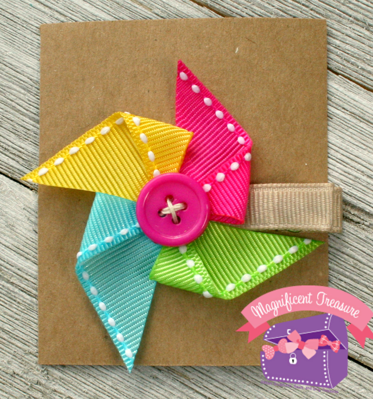 The pinwheel is made with 4 different saddle stitched ribbon with a button sewn in the center. It measures about 2 inches across.
