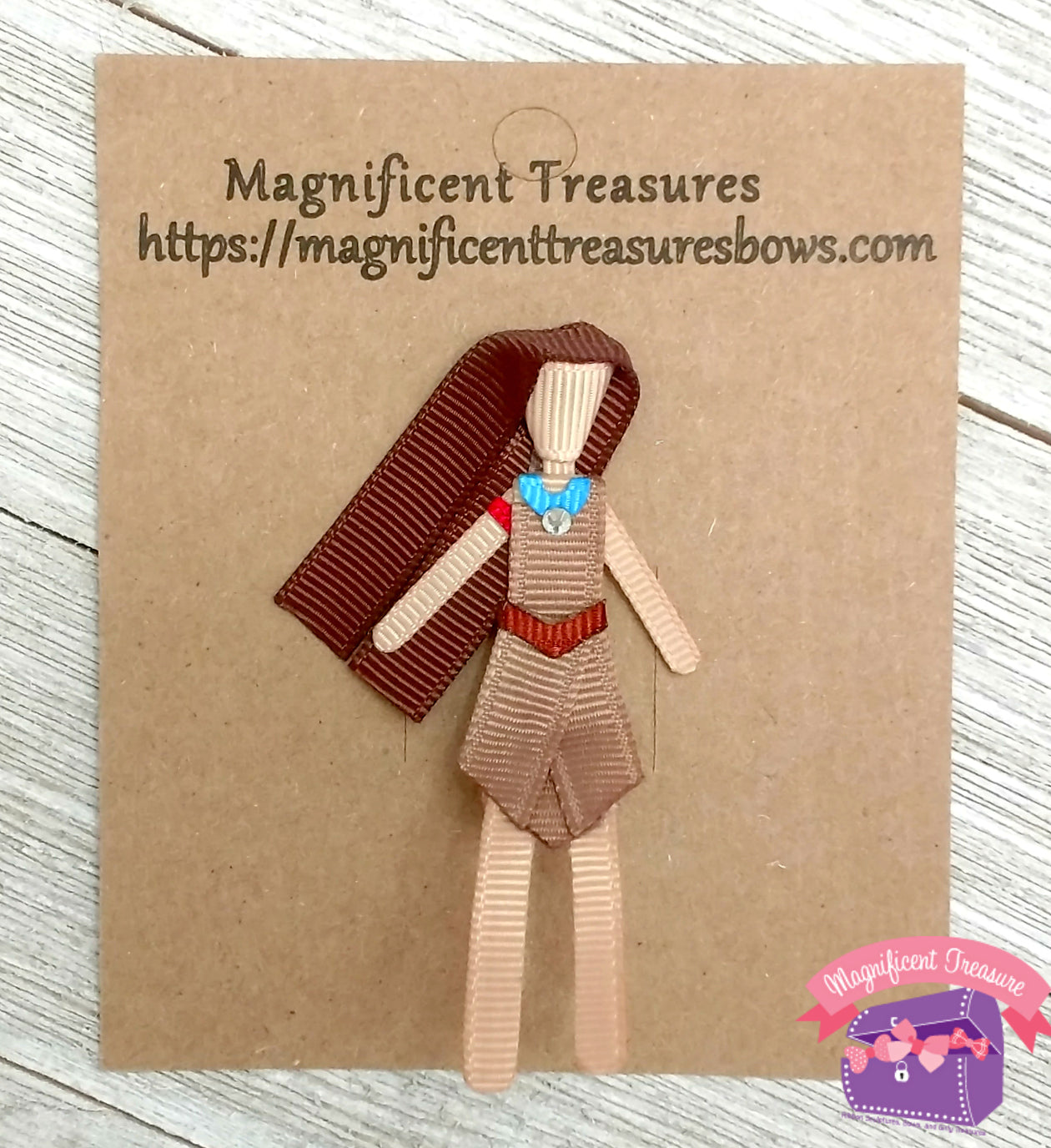 Pocahontas is made completely of ribbon. She is about 3" tall with a clip that runs up her back to provide stability and so she can be worn on either side of the head. If you would prefer her on a horizontal clip please leave a note to seller at checkout.