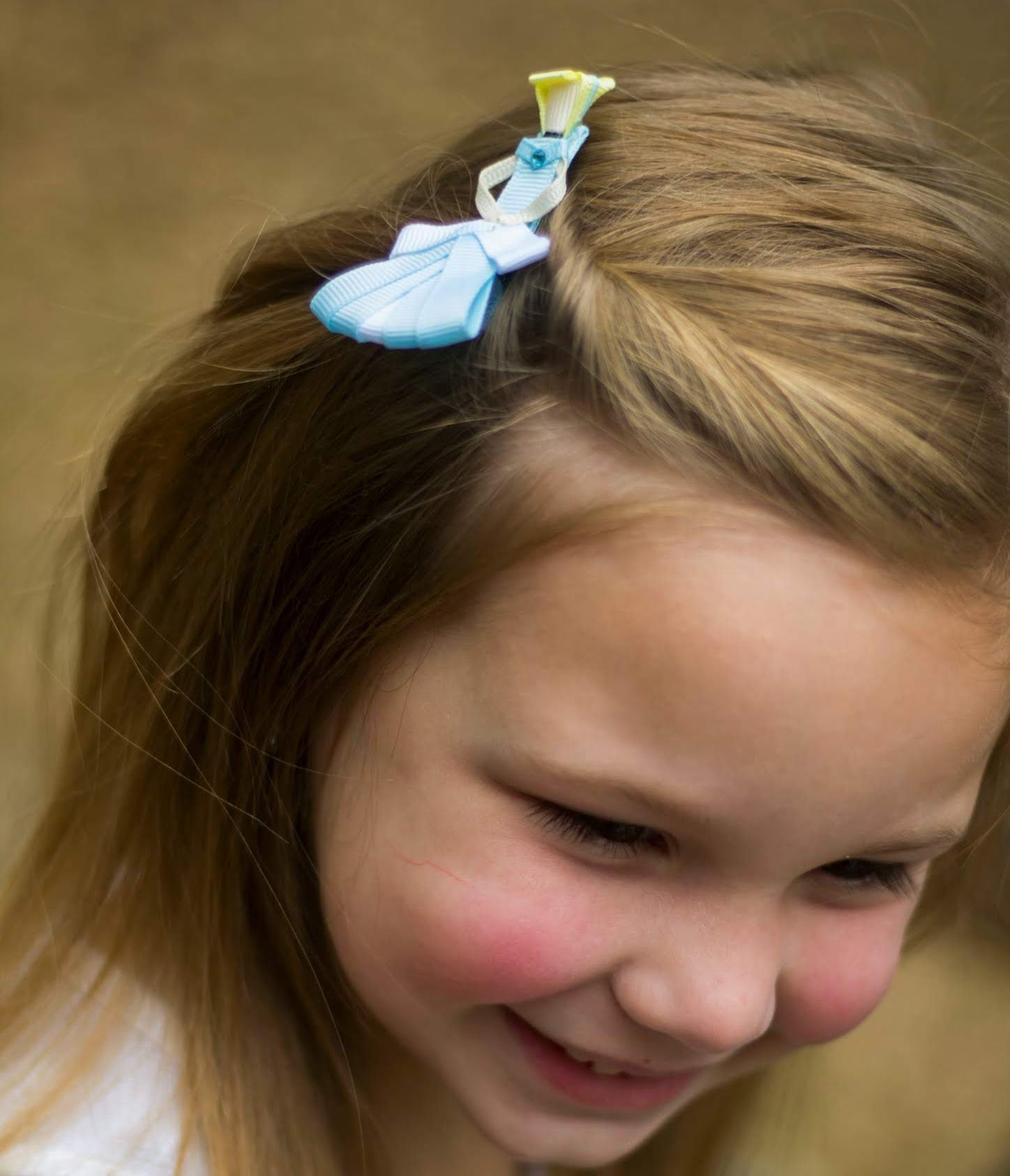 Each princess can come attached to a partially lined single prong alligator clip, a double prong alligator clip, or a pin. A no slip grip can be added to the alligator clips. The clip runs up the back of the princess to provide stability and so they can be worn on either side of the head.