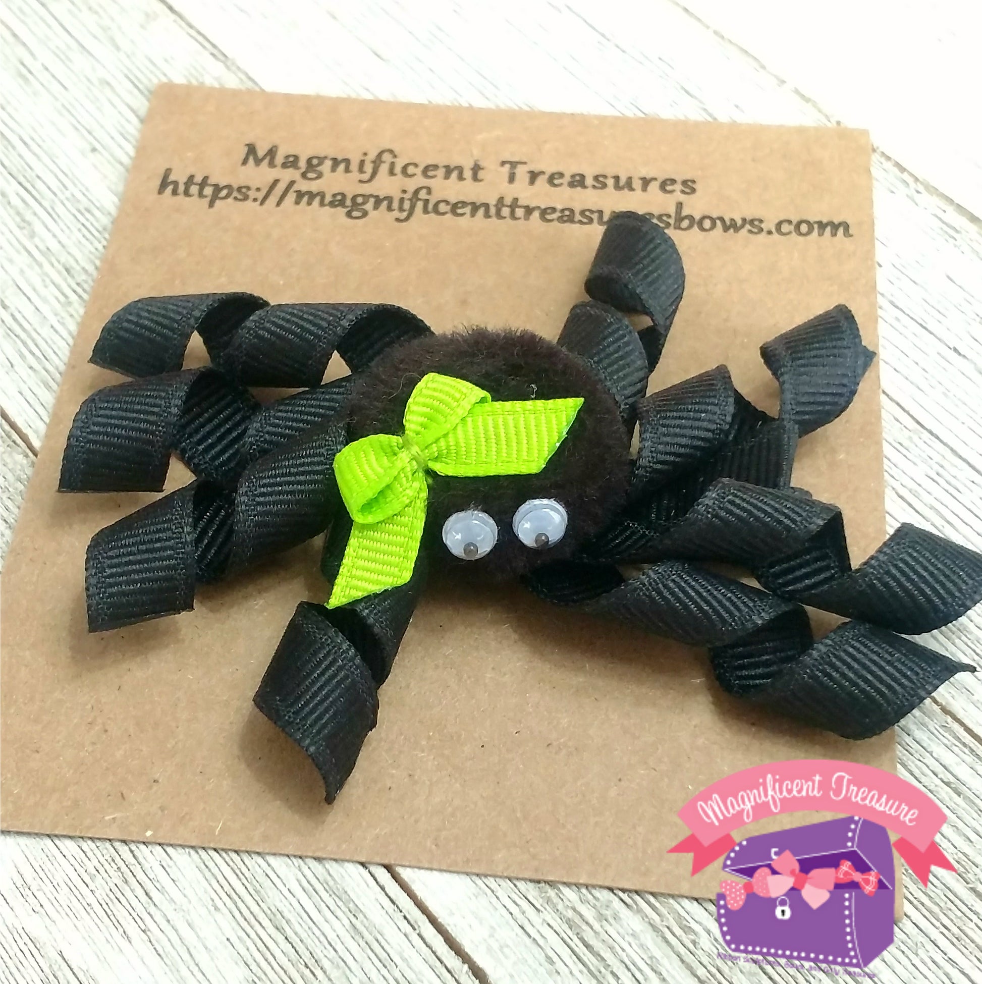 It is made with a pompom and high quality grosgrain ribbon that has been heat sealed to prevent fraying. The spider is about 3 inches across.